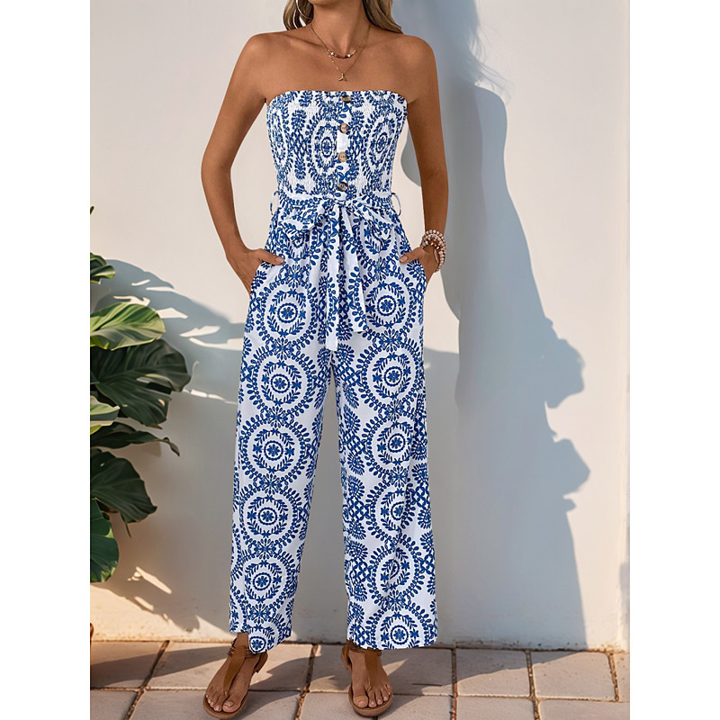 Women's Normal Jumpsuit Active Floral Sleeveless Strapless Backless Pocket Vacation Daily Regular Fit Blue Summer