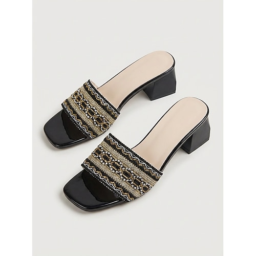 Sandali da donna neri con tacco a blocco e cinturino decorato in oro e argento – scarpe da crociera per resort e ponti