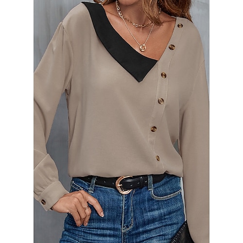 Per donna Camicia Blusa Tinta unica Essenziale Informale Manica lunga A V Top regolari Giornaliero Collage Bottoni Marrone Primavera Autunno