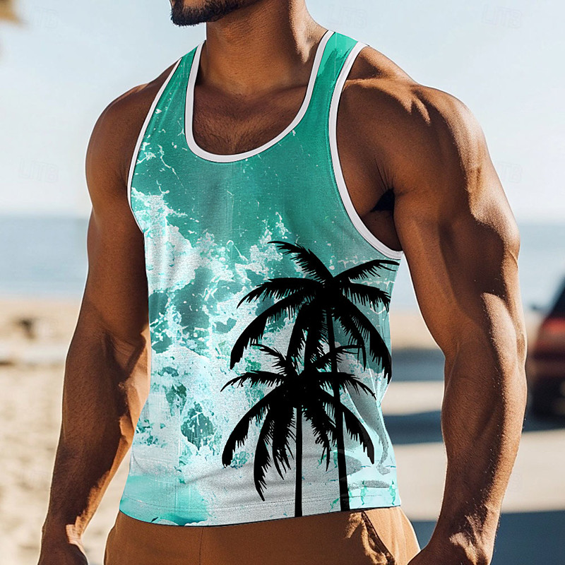 Men's Coconut Palm T Shirt Vest Top Sleeveless T shirt 3D Print Crew Neck Round Neck Shirt Vacation Casual Hawaiian Holiday Blue Red Green Summer Spring Clothing Apparel S M L XL XXL XXXL