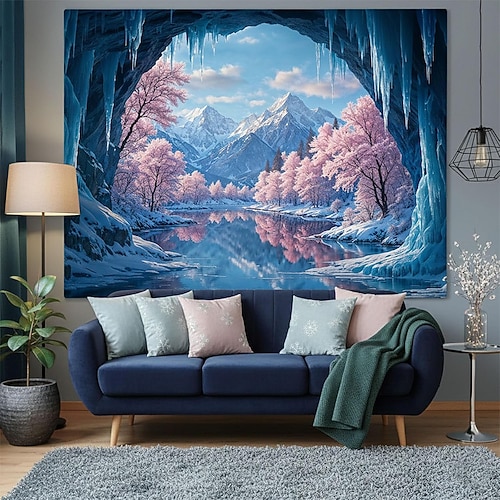 Arazzo da parete 3D con grotta di ghiaccio, paesaggio invernale, alberi innevati rosa, lago di montagna riflesso, decorazione murale, arte naturale estetica, sfondo per soggiorno e camera da letto