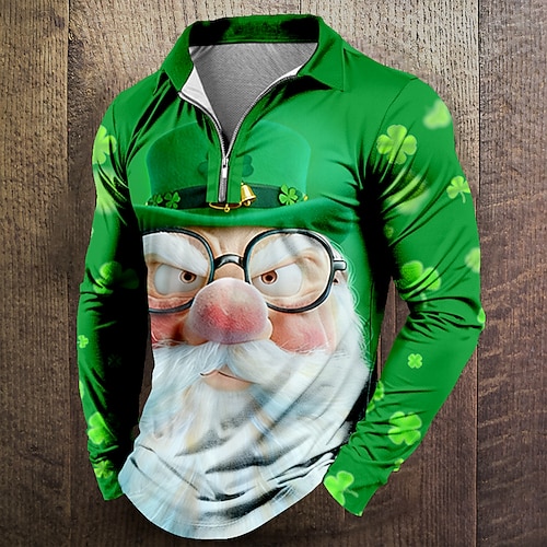 Giorno di San Patrizio Per uomo Elfo di Natale Polo con zip Manica Lunga Magliette polo Bavero Casual All'aperto Abito da festa Stampa 3D Primavera Autunno Verde