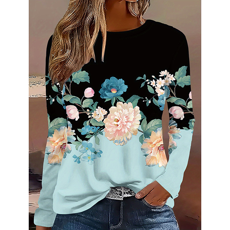 Women's Plus Size Tops T Shirt Floral Print Long Sleeve Crew Neck Casual Daily Polyester Fall Winter Blue Black