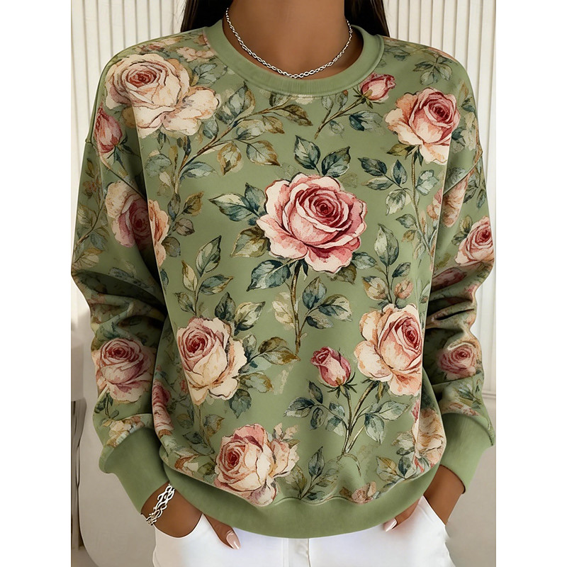 Women's Pullover Sweatshirt Floral Casual Long Sleeve Crew Neck Regular Tops Casual Street Dailywear Green Spring Fall Winter