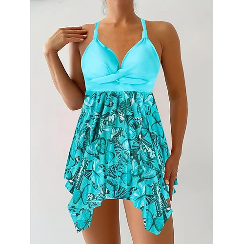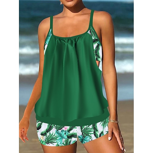 Costume da bagno tankini da donna a 2 pezzi alto in vita controllo della pancia schiena scoperta per vacanze al mare stampa floreale colletto a U e senza maniche