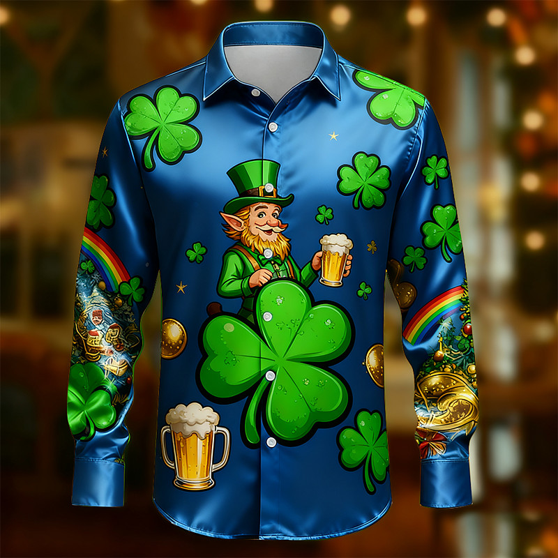St. Patrick's Day Men's Beer Clover Saint Patrick Shirt Satin Shirt Dress Shirt Long Sleeve Vintage Retro Party Holiday Summer Spring Turndown 3D Print Button Up Shirts Blue