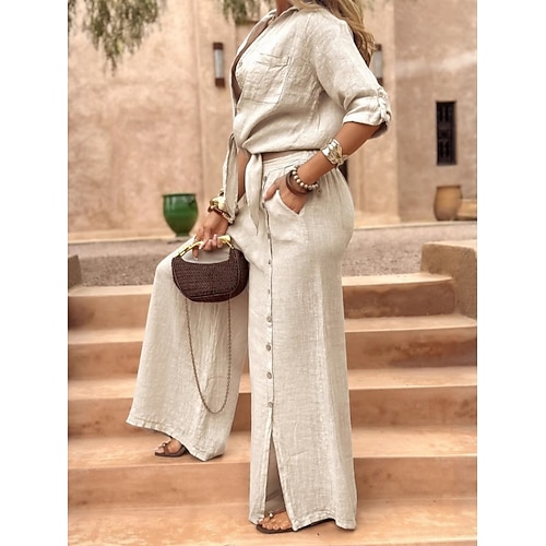 Per donna Set di Pantaloni Bolero Finto cotone e lino Manica 3/4 Colletto a Camicia Semplice Moda Streetwear Quotidiano Casuale Quotidiano All'aperto Bianco Marrone Verde Estate Vestibilità comoda