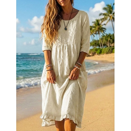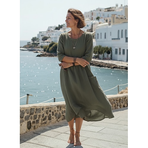 Per donna Abito Midi Finto cotone e lino Abito da Spiaggia Vestito Casual Vestito Estivo Vacanza Essenziale Ferie Weekend Vestibilità comoda Semplice Manica 3/4 Girocollo Blu Nero Verde Albicocca