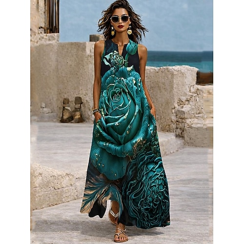 Per donna Abito maxi Vestito Estivo Abito a trapezio Abito Estivo Vacanza Casual Boho Quotidiano Ferie Vestibilità comoda Floreale Grafico Senza Maniche Scollo a V Verde scuro Estate Primavera