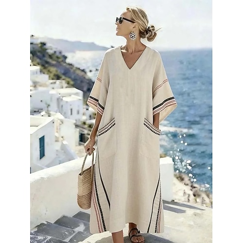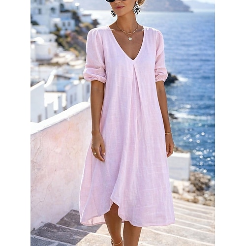 Per donna Abito Midi Finto cotone e lino Abito a trapezio Casual Quotidiano Vestibilità comoda Semplice Manica 3/4 Scollo a V Blu Nero Bianco Giallo Estate Primavera Autunno