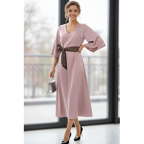 Linea ad A Lunghezza Tè Abito da invitata a nozze Abito Formale Abito da sera Abiti da Ballo Elegante Manica 3/4 Scollo a V Balli di fine anno Formale Raso con Fiocco/Fiocchi