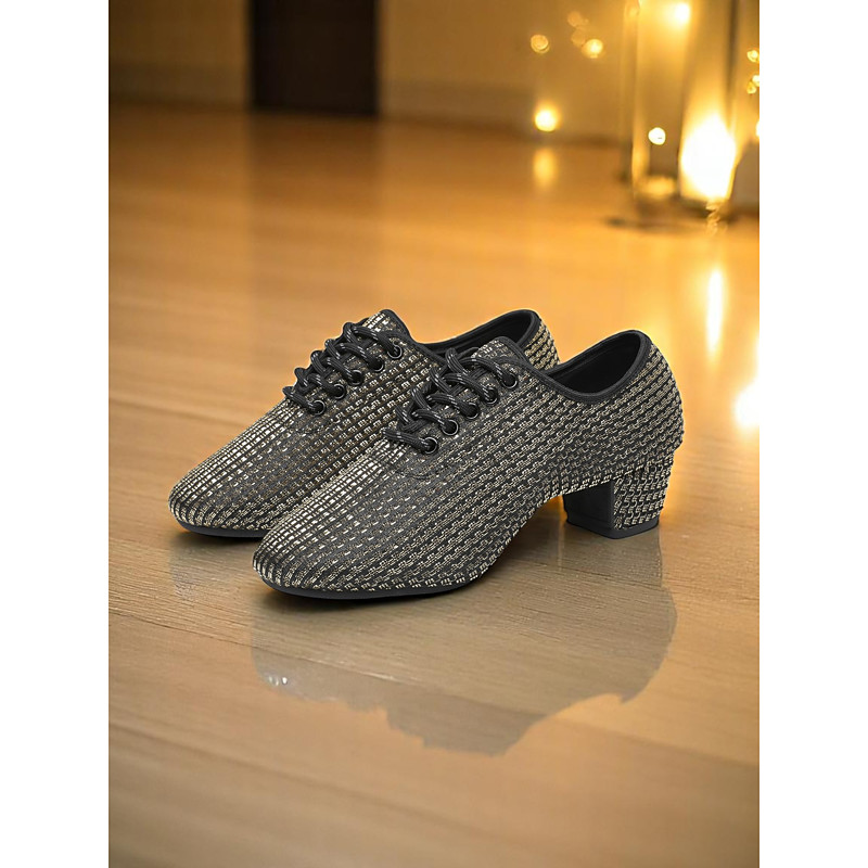 Women's Rhinestone Ballroom Dance Shoes - Mesh Open-Toe Latin Heels with Low Block Heel, Sparkly Party Style for Salsa, Tango Formal Dance Events