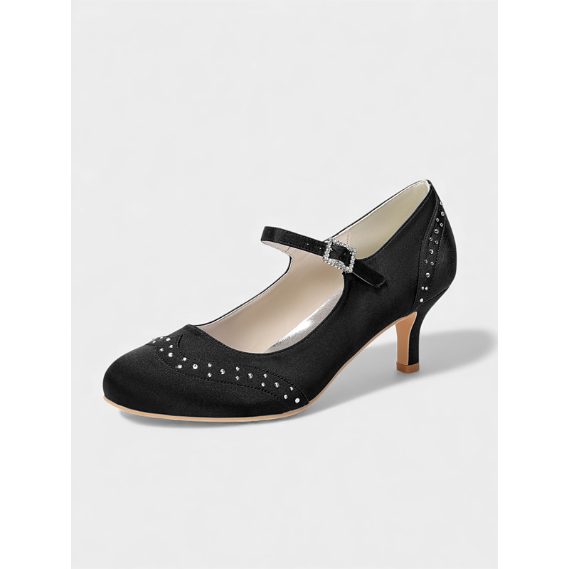 Women's Satin Latin Dance Shoes with Rhinestone T-Strap and Mid Heels, Professional Ballroom Salsa Sandals for Competition or Practice