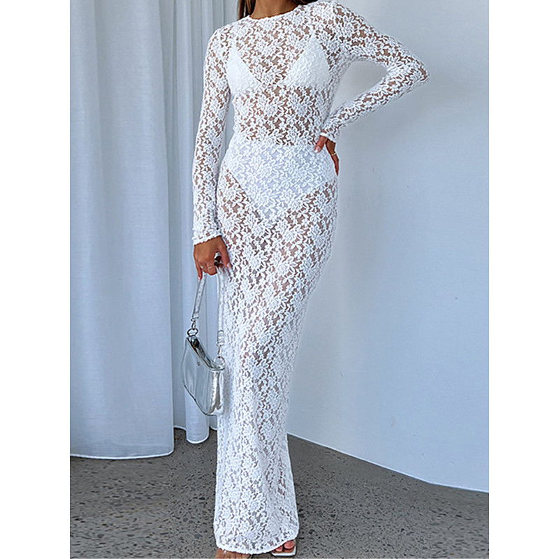 Women's Long Dress Maxi Dress White Dress Black Dress Lace Dress Casual Dress Streetwear Maxi Sexy Vacation Street Holiday Slim Long Sleeve Round Neck Black White Summer