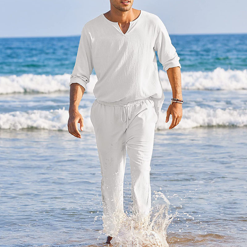 Men's Cotton Linen Shirt White Cotton Shirt 2 Piece Shirt Set Button Up Shirt Summer Shirt Black White Pink Long Sleeve Plain V Neck Spring Summer Outdoor Holiday Clothing Apparel