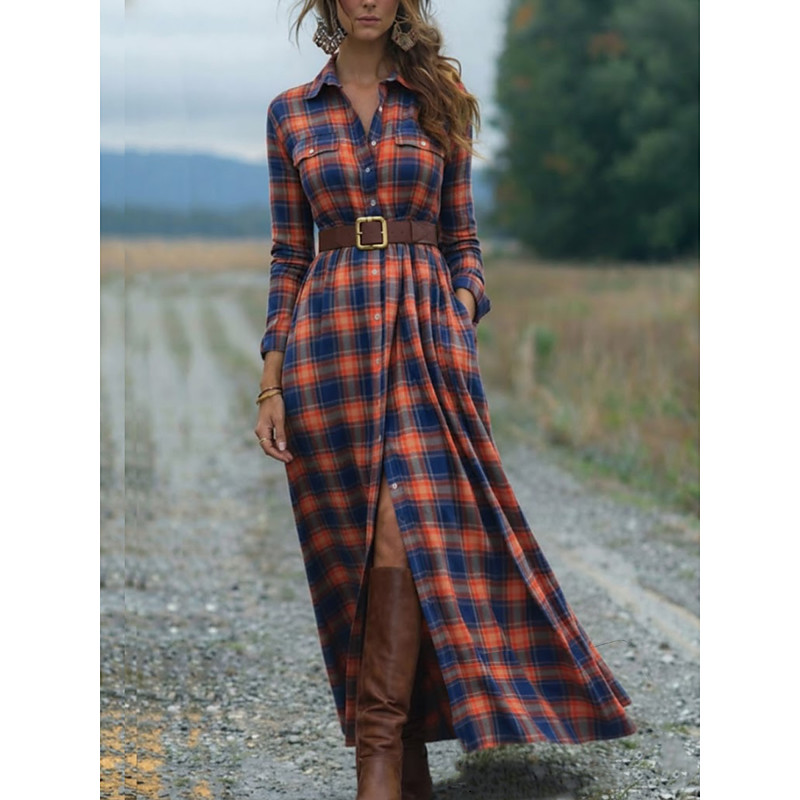 Women's Maxi Dress Shift Dress Vacation Casual Boho Daily Regular Fit Plaid Long Sleeve Lapel Yellow Red Green Spring Fall