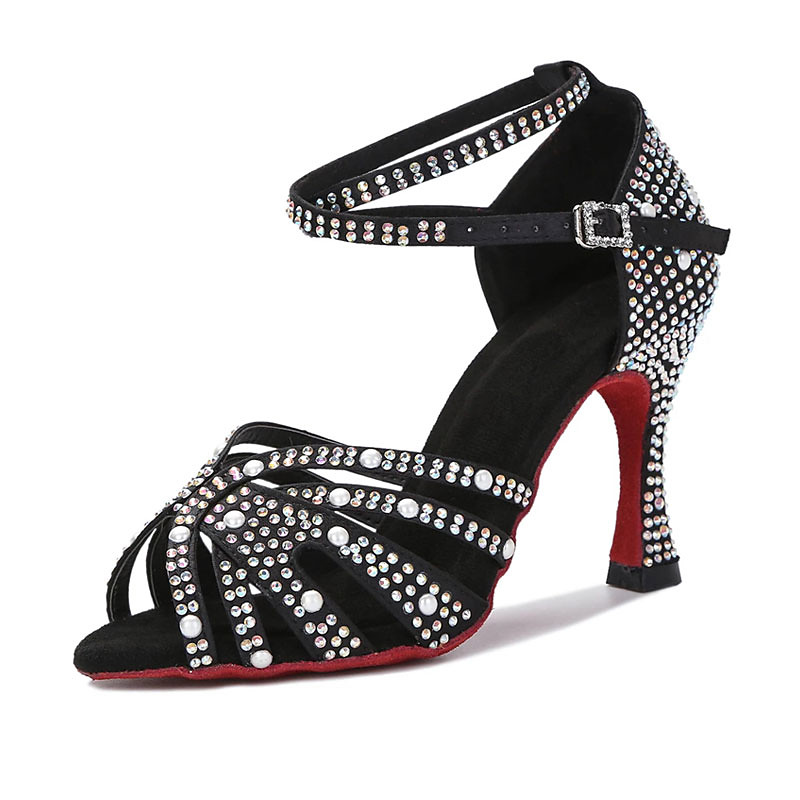 Women's Black Rhinestone Latin Dance Shoes – Peep-Toe High Heel Ballroom Salsa Sandals for Performance Competition