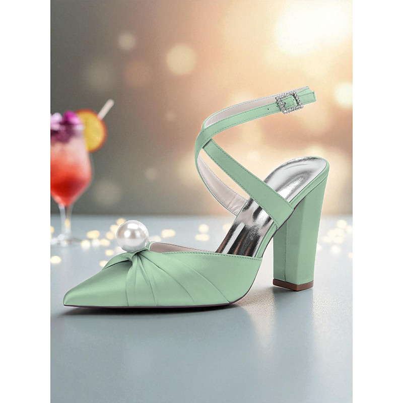 Women's Green Satin Wedding Sandals – Rhinestone Ankle Strap Block Heel Open Toe Bridal Shoes for Evening Prom