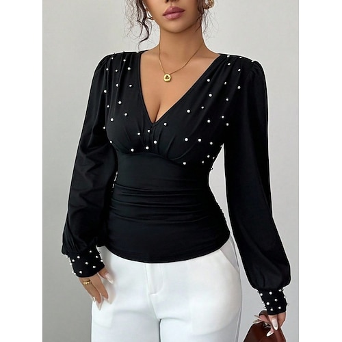 Per donna Blusa Tinta unica Elegante Casual Manica Lunga Scollo a V Top Regolari Quotidiano Con perline Nero Vino Albicocca Primavera Autunno Inverno