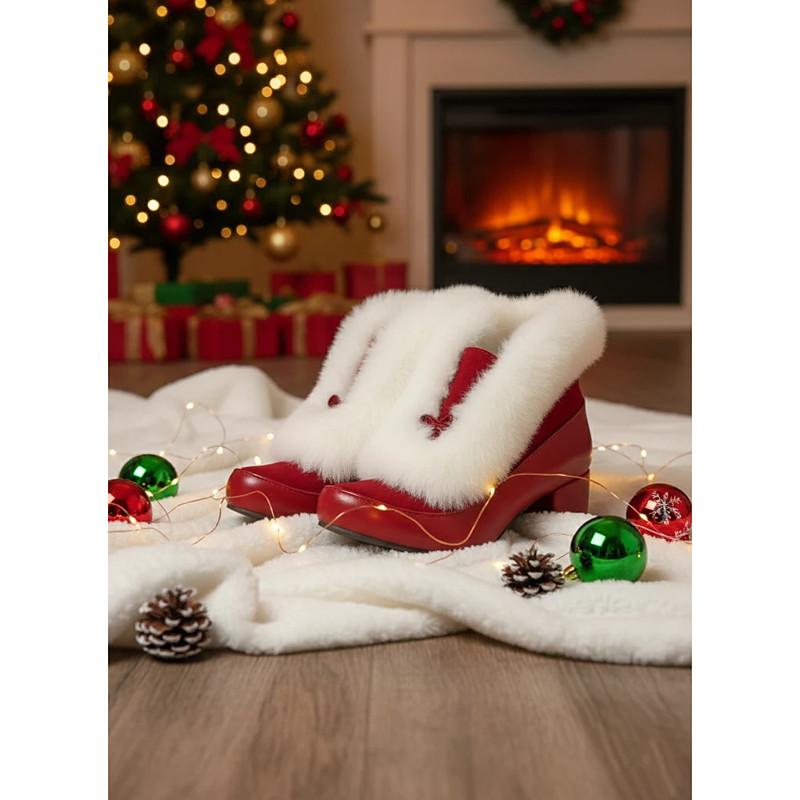 Women's Retro Style Red Fur-Lined Ankle Boots with Block Heel - Perfect for Winter Holidays and Christmas Celebrations
