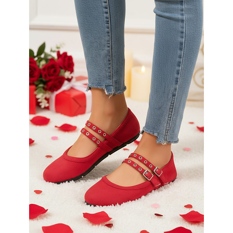 Women's Red Flats with Studded Strap Detail - Elegant and Comfortable Mary Jane Style Shoes, Perfect for Valentine's Day and Winter Festivities.