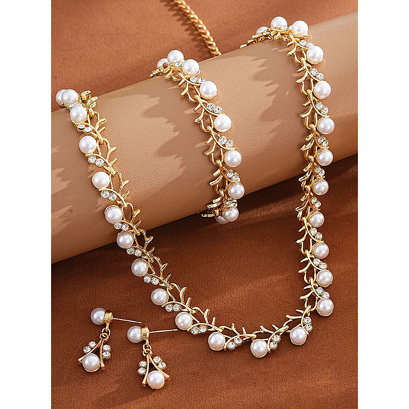 Women's Imitation Pearl Alloy Jewelry Set – 3-Piece Necklace, Bracelet, and Earrings Set, Perfect for Weddings and Special Occasions