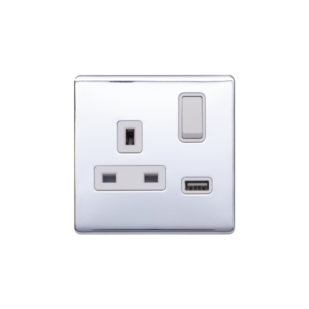 Lieber Polished Chrome 1 Gang 13A DP Socket with USB-A 2.1A - Size: 86mm x 86mm x 3.3 mm