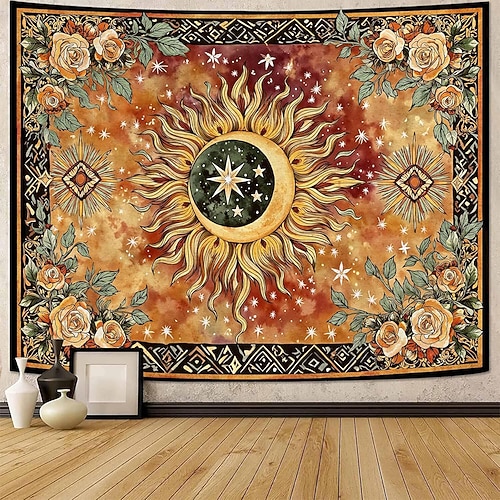 arazzo da parete vintage con sole celeste, volto di girasole, zodiaco, astrologia, oroscopo, arte floreale decorata, decorazione estetica per la stanza, camera da letto, soggiorno, sfondo