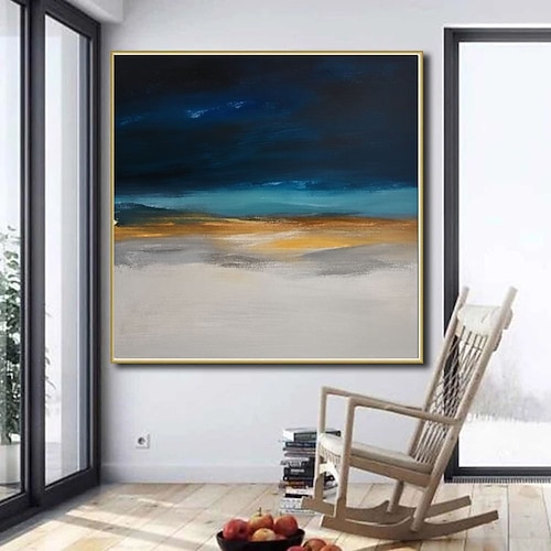 blu scuro dorato dipinto a mano Pittura ad olio minimalista con forme astratte in grigio su tela, ideale per decorare le pareti di soggiorno e camera da letto.