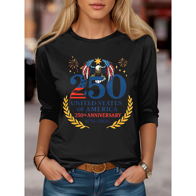 American 250th Women's Independence Day T Shirt Graphic USA Flag Fashion Stylish Classic Long Sleeve Crew Neck Regular Tops Daily Weekend Print Black White Red Summer Spring Fall