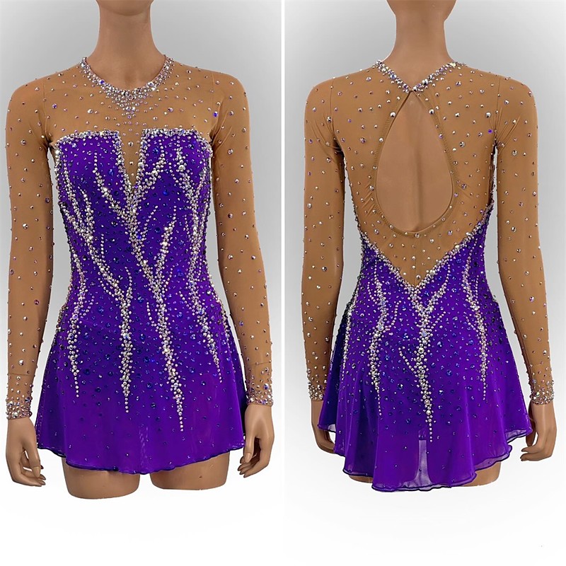 Figure Skating Dress Women's Girls' Ice Skating Dress Purple Patchwork Open Back Mesh High Elasticity Training Competition Skating Wear Classic Crystal / Rhinestone Long Sleeve Ice Skating Figure