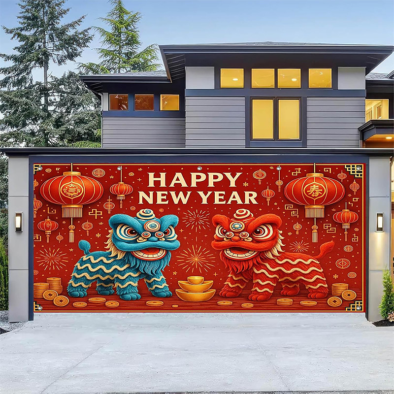 New Year Tapestry Garage Door Cover Large Hanging Backdrop 2026 Fireworks Cute 3D Party Outdoor Holiday Shooting Backgrounds Yard Home Decor