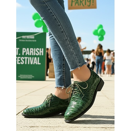 Grüne Oxford-Schuhe in Kroko-Optik für Damen – Schnürschuhe mit niedrigem Absatz für die St. Patrick's Day Parade und Outfits für irische Feste Feiertagsfeiern