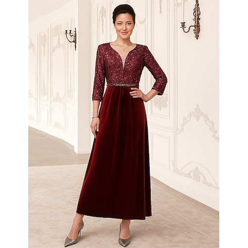 Linea ad A Lunghezza alla caviglia Vestito da Festa Abito da Cocktail Abito da invitata a nozze Abito da cerimonia per signora Manica 3/4 Scollo a V Elegante Lussuoso Brillare Splendere Cocktail