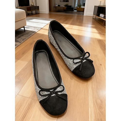 ballerine da donna in pelle scamosciata nera con dettagli glitterati: elegante design con fiocco, perfette per eventi serali, feste e occasioni speciali