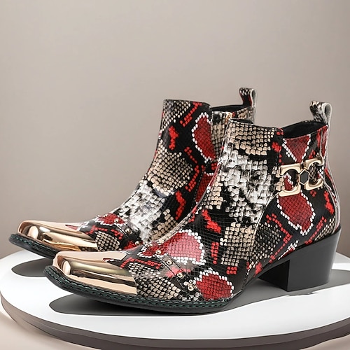 stivaletti da uomo con stampa serpente rossa e nera: pelle pregiata con dettagli dorati, scelta elegante per feste di Natale e occasioni festive