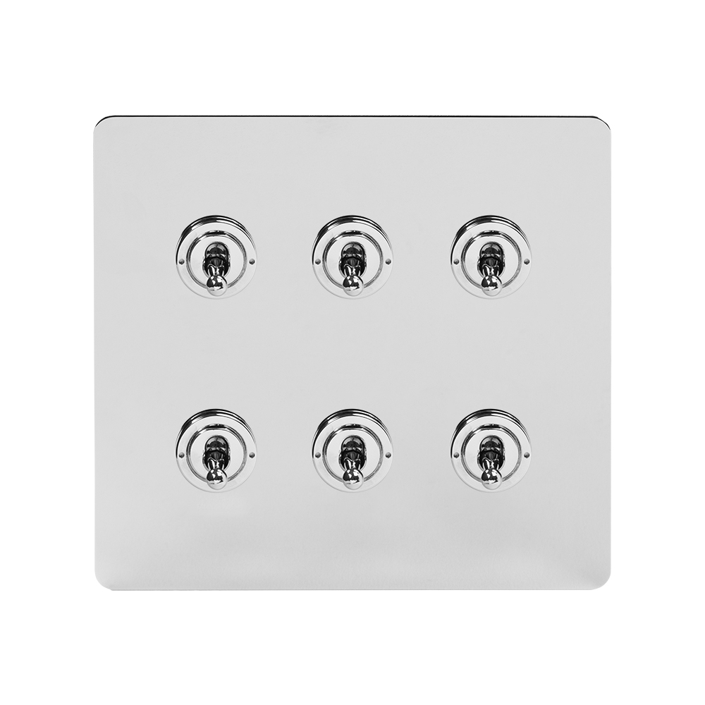 Soho Lighting Polished Chrome Flat Plate 6 Gang Toggle Light Switch 20A 2 Way Screwless - Size: H 146mm x W 146mm