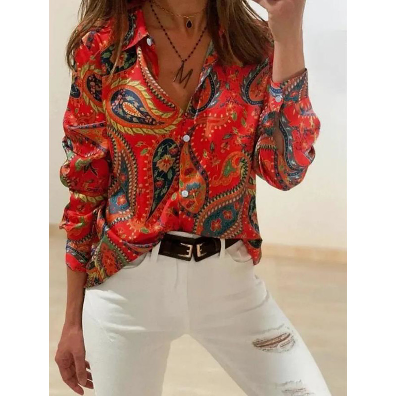 Women's Shirt Button Down Tunic Shirt Collar Long Sleeve Hawaiian Casual Graphic Regular Tops s Print Regular Fit Work Daily Red Holiday Clothes