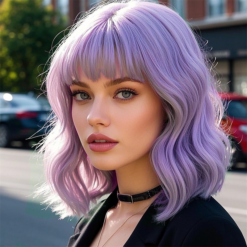 Purple Wig with Bangs Soft Short Bob Wavy Wigs for Women Synthetic Shoulder Length Women's Curly Wigs for Halloween Costumes Cosplay Daily