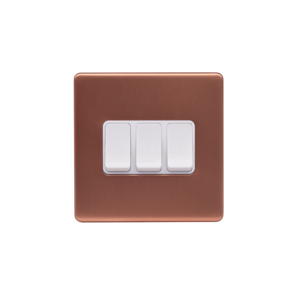 Lieber Brushed Copper 10A 3 Gang 2 Way Switch - White Insert Screwless - Size: 86mm x 86mm x 2 mm