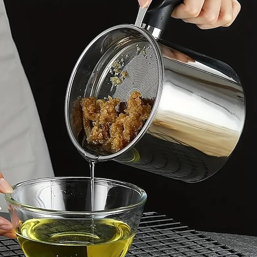contenitore per grasso in acciaio inossidabile con filtro – contenitore per olio da 47,34 once con coperchio, beccuccio di versamento sicuro e maniglia, utensile da cucina per filtrare e conservare il