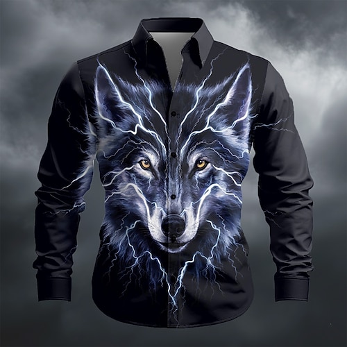 Per uomo Animale Lupo Alleggerimento Camicia Camicia con Bottoni Manica Lunga Moda Casual All'aperto Abbigliamento Quotidiano Primavera Autunno Collo ripiegato Stampa 3D camicie con colletto Nero