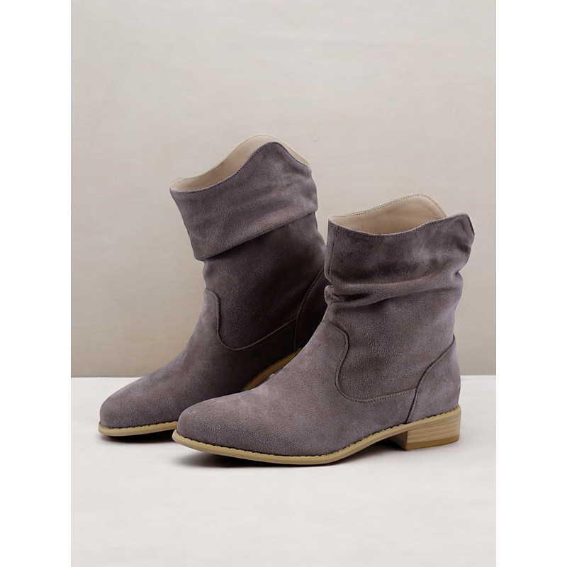 Women's Trendy Slouchy Mid Calf Boots - Beige Faux Suede Low Heel Comfortable Casual Boots for Everyday Wear