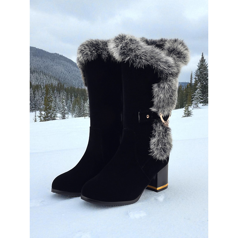 Women's Black Faux Fur Lined Winter Boots - Chunky Heel Velvet Snow Boots with Gold Accent for Cold Weather, Ski Trips and Holiday Outfits