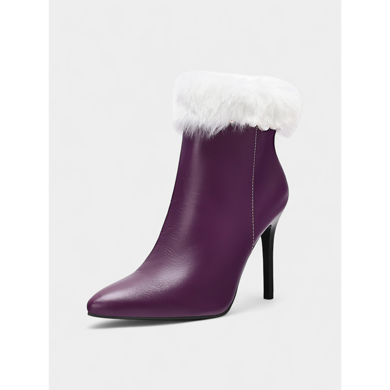 Women's Red Faux Leather Ankle Boots with Faux Fur Cuff and Zipper, Pointed Toe, Stylish Stiletto Heel, Perfect for Christmas, Holiday Parties and Festive Occasions