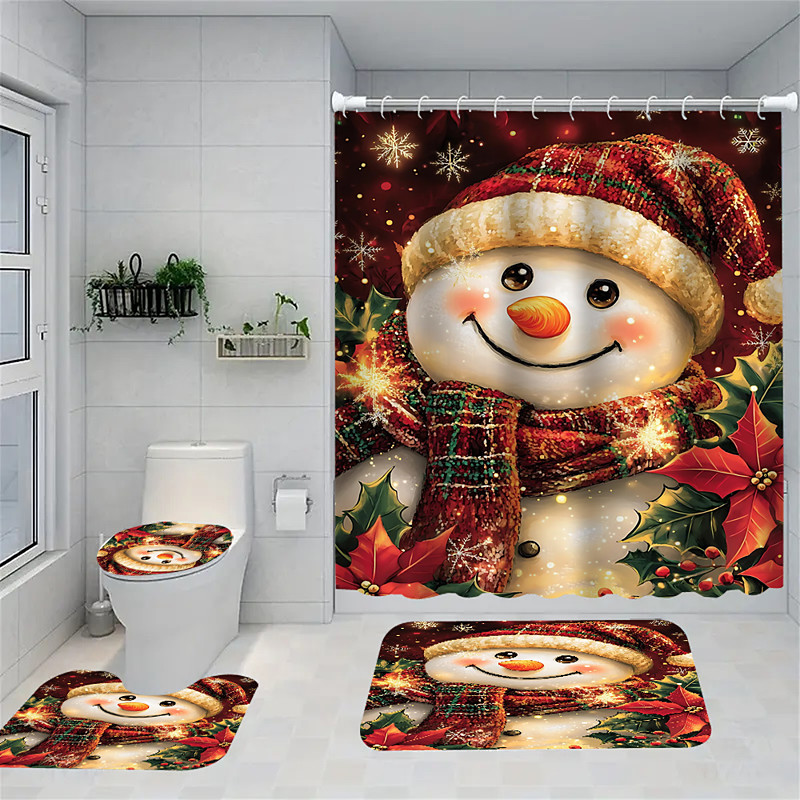 4-Piece Bathroom Set, Waterproof Polyester Shower Curtain with 12 Hooks 180cm180cm(7070), Non-Slip Toilet Lid Cover Sturdy Bath Mat for Home Decor