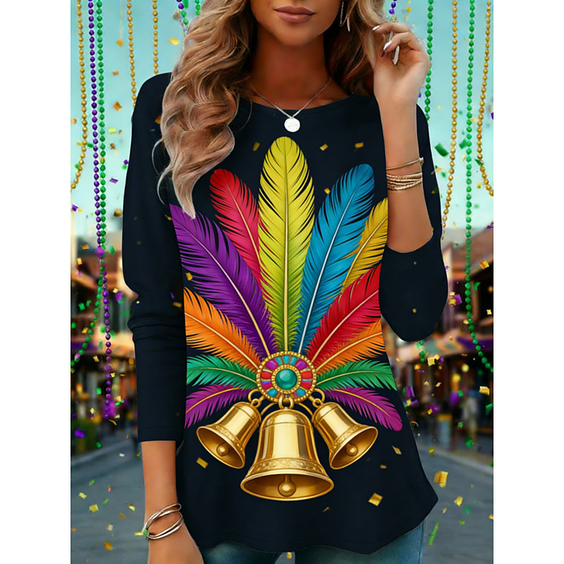 Carnival Women's T Shirt Tee Top Graphic Feather Fashion Stylish Classic Long Sleeve Round Neck Regular Tops Daily Weekend Vacation Wear Print Black Spring Fall