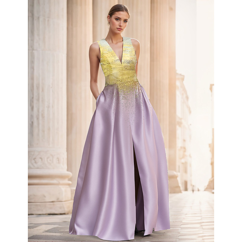 A-Line Floor Length Evening Gown Ball Gown Formal Dress Elegant Celebrity Style Sleeveless V Neck Garden Party Wedding Satin with Slit Pocket