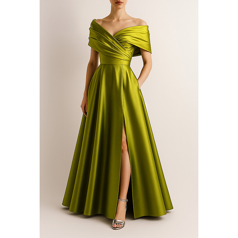 A-Line Floor Length Evening Gown Ball Gown Formal Dress Elegant Silky Sleeveless Off Shoulder Wedding Formal Pocket Stretch Satin with Pleats Beading Slit