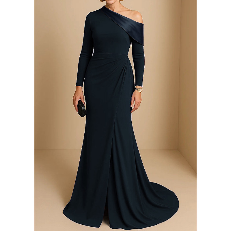A-Line Sheath Column Sweep Brush Train Prom Dresses Evening Gown Ball Gown Formal Dress Elegant Glittering Celebrity Style Long Sleeve One Shoulder Garden Party Wedding Satin Stretch Satin with Ruched